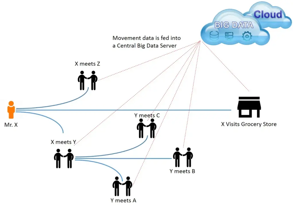 • The central control system then pulls all the information of Mr.X from the last 14 days, including all the different places he has been and the different people he has come in contact with.