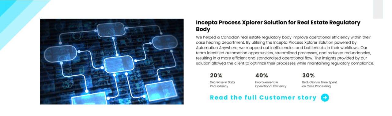 Learn how we partnered with a Canadian real estate regulatory body to improve their operational efficiency using the Incepta Process Xplorer Solution from Automation Anywhere.