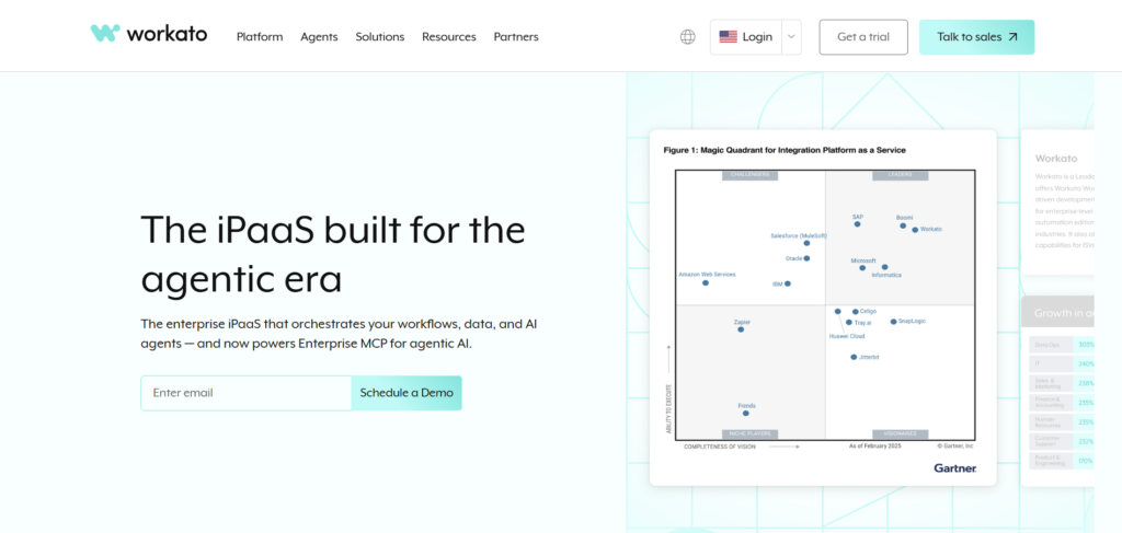 • No/low‑code priority: Workato (recipes), SnapLogic (visual)
